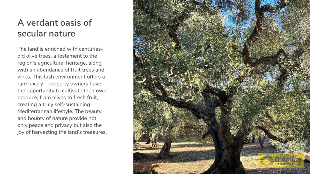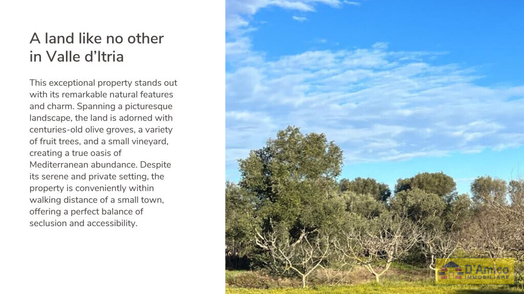 In Ostuni, named the ‘White City’ , we are offering you for sale this plot of land, measuring about 20,000 square metres, with an approved project for a Modern Villa with a 125 square metre swimming pool and a Complex of Trulli to be renovated.