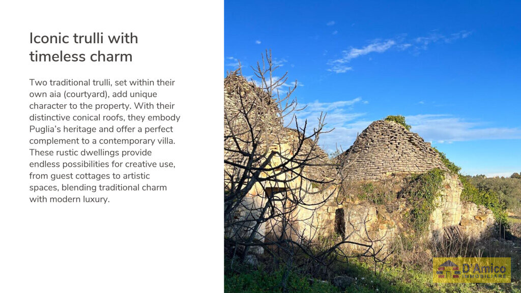 The project for the construction of the villa has been approved, with the start of work already communicated. The project for the restoration of the trulli, on the other hand, can be defined according to your preferences.