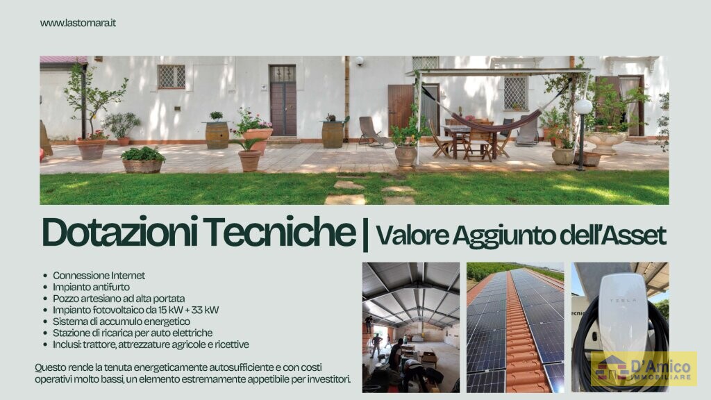 Tra i numerosi plus tecnici della proprietà si evidenziano: connessione internet, impianto antifurto, un pozzo artesiano ad alta portata, e soprattutto un sistema energetico all’avanguardia, composto da due impianti fotovoltaici (uno da 15 kW e l’altro da 33 kW) collegati ad un innovativo sistema di accumulo di energia di recente installazione. Questo sistema garantisce la quasi totale autonomia energetica della tenuta ed è collegato anche a una colonnina per la ricarica di veicoli elettrici.