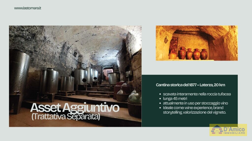 In aggiunta, con trattativa separata, è disponibile una preziosa Cantina Storica del 1877, situata nel vicino comune di Laterza, a 20 km di distanza. La cantina, interamente scavata nella roccia tufacea, si estende per 45 metri nel sottosuolo ed è tuttora utilizzata per la conservazione del vino.