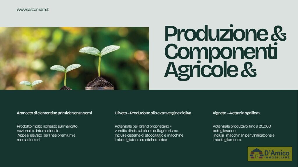 La proprietà si estende su un terreno pianeggiante esposto a sud-est, comprendente un maestoso aranceto di clementine primizie senza semi – molto richieste sul mercato – un oliveto, per la produzione di olio extravergine d’oliva e un vigneto di 4 ettari a spalliera, con un grande potenziale commerciale: la produzione annua può raggiungere le 20.000 bottiglie.