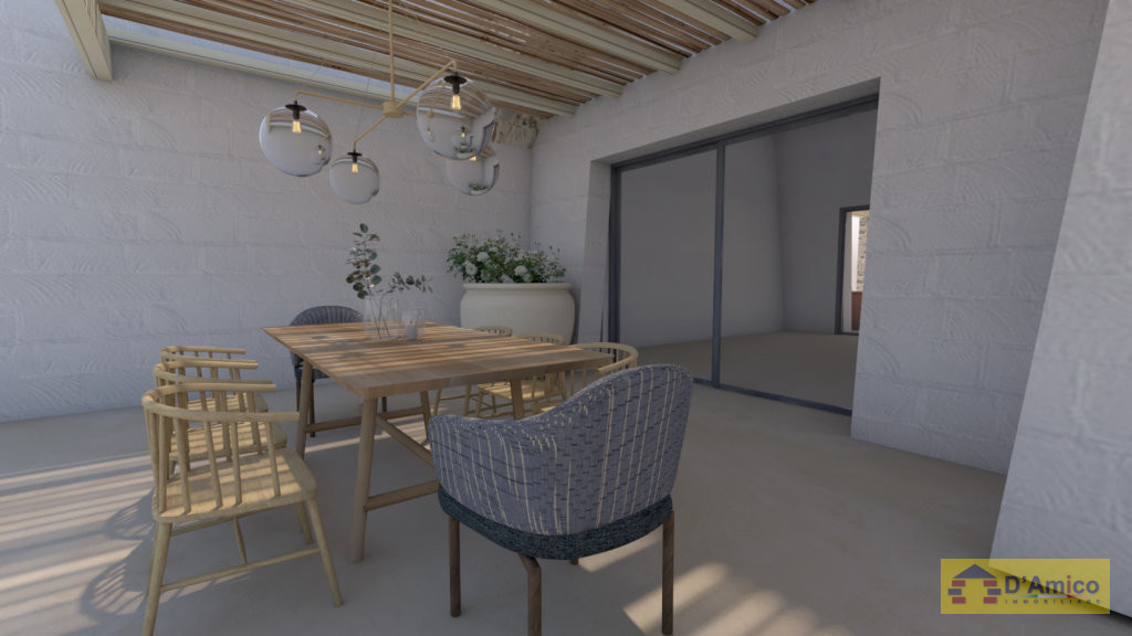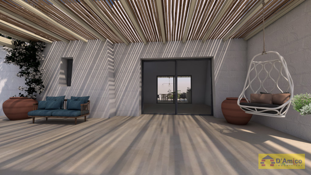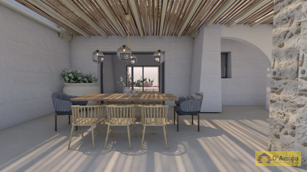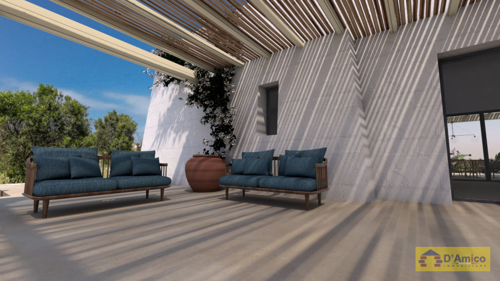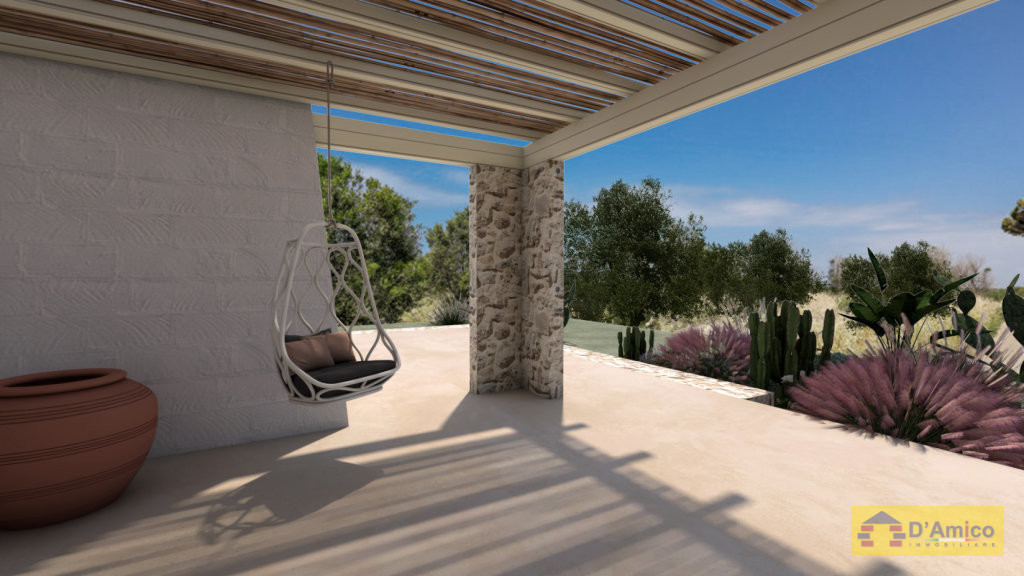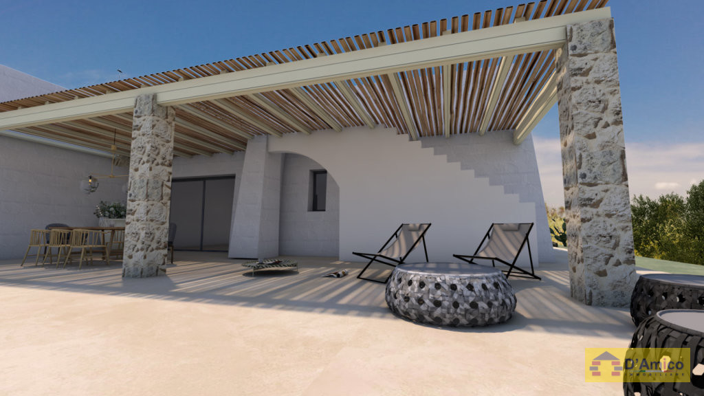 The Villa with sea view is entirely spread on the ground floor, and consists of a large living room and open space kitchen with large windows on two sides, so very bright, 5 double bedrooms, 3 bathrooms, 1 laundry room and outdoor porch of 46 square meters. The interiors have a star vault, and therefore recall the ancient style of the traditional houses and villas of Salento. On the terrace overlooking the sea you can install gazebos to create a private area, with gazebo