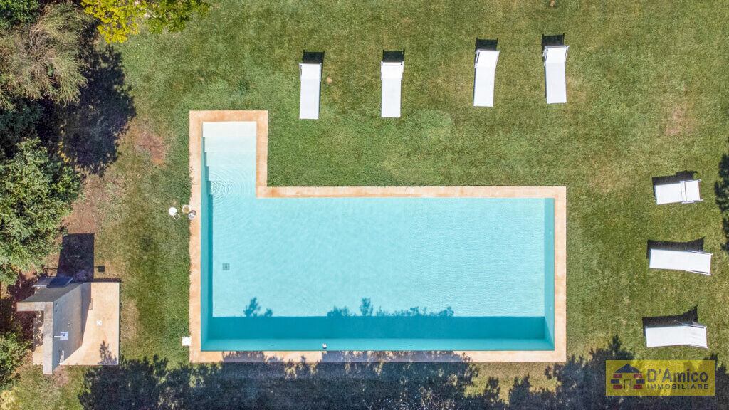 After the entrance there is a court that, on the right, is opened in a large room organized as kitchen and dining area, connected with a Garden of 3000 square meters and Swimming Pool.