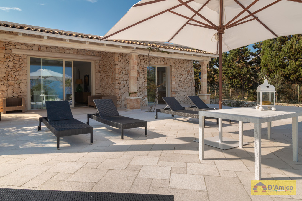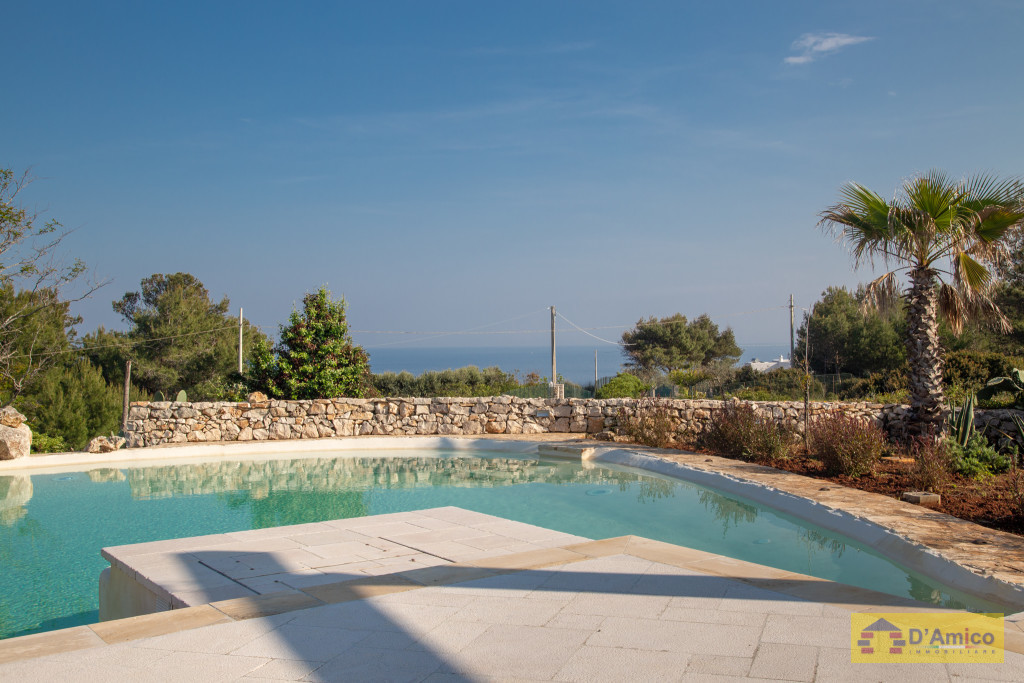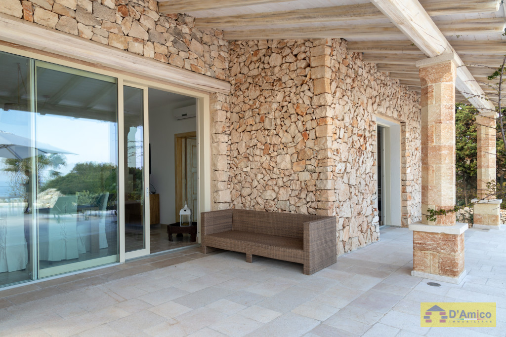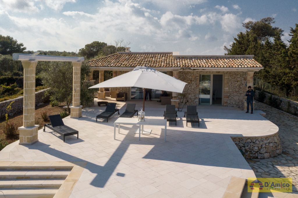 D'AMICO IMMOBILIARE vende Villa con Piscina vista mare di 150 metri quadri coperti, su un giardino di 1.200 metri quadri , caratterizzato dalla presenza di piante tipiche della macchia mediterranea quali, cespugli di mirti, fichi d'india, ulivi secolari, siepi, rosmarino , timo. La Villa è realizzata in pietra viva tipica del Salento, ed è composta da Soggiorno, 4 Camere da letto matrimoniali, 5 bagni, una cucina, un bagno esterno, e Porticati esterni dai quali ammirare la bellissima vista mare.
