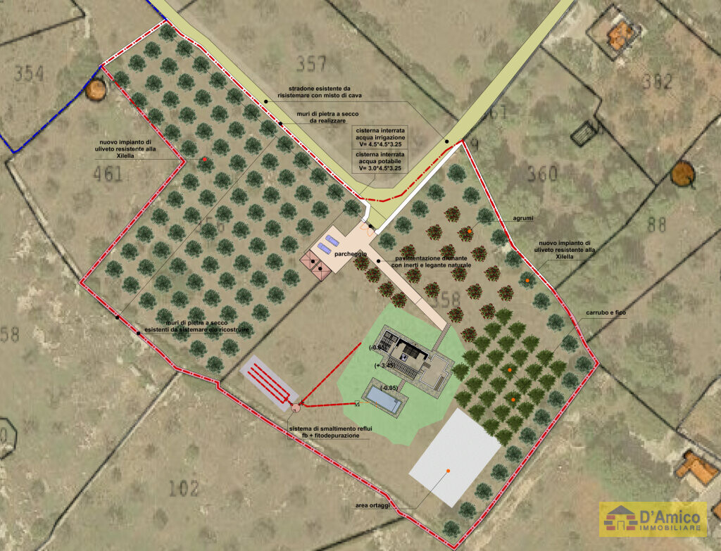 Adiacente al terreno in vendita di 13.400 metri quadri, proponiamo in vendita altri terreni. Di cui due, ognuno con progetto approvato per una Villa di 120 metri quadri con Piscina. E un terreno di 7.500 metri quadri con possibilità di realizzare una Villa con piscina di 94 metri quadri coperti con volta a stella e volta piana.