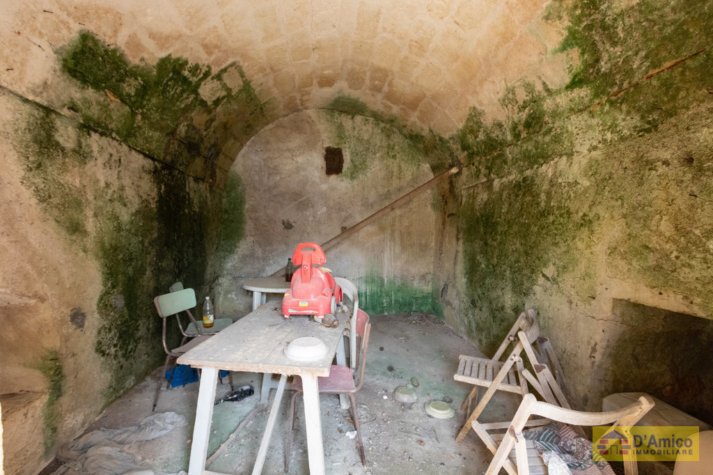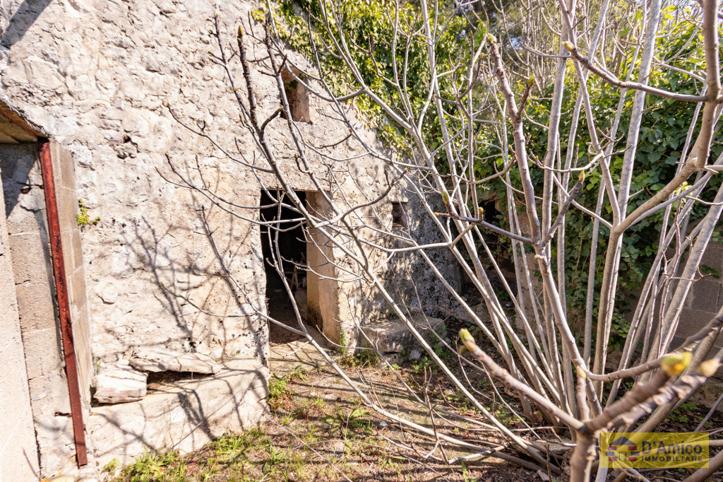 Il fabbricato rurale di 30 metri quadri coperti, in buone condizioni, è realizzato in pietra a secco ed è costituito da una stanza con volta a botte, all'interno della quale c'è un caminetto. Il secondo fabbricato in pietra a secco, è immerso in una pineta con cespugli di Macchia Mediterranea. Ha una superficie coperta di 20 metri quadri ed ha il tetto crollato da recuperare. Ristrutturando entrambi, si possono realizzare due dependance, ciascuna composta da 1 camera con bagno e pergolato esterno. L'ampio terreno della proprietà vista mare è in parte recintato da muretti a secco e caratterizzato dalla presenza di alberi di ulivo, fico, piante di fico d'india, alberi di pino, mandorlo. Inoltre, è presente un pozzo artesiano per l'approvvigionamento di acqua dolce.