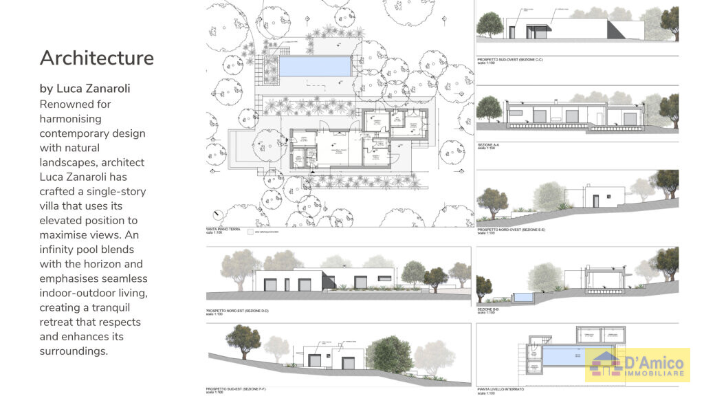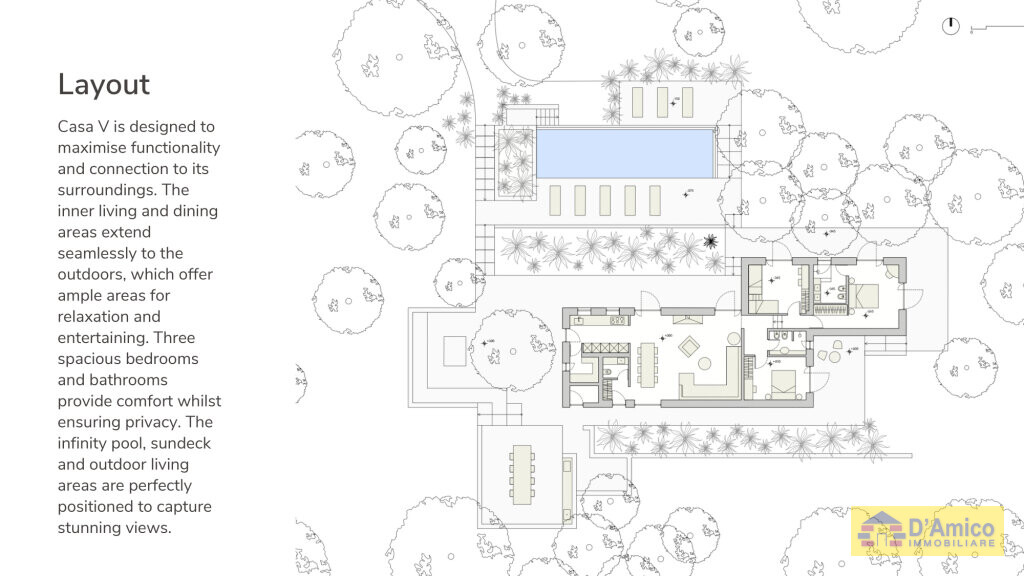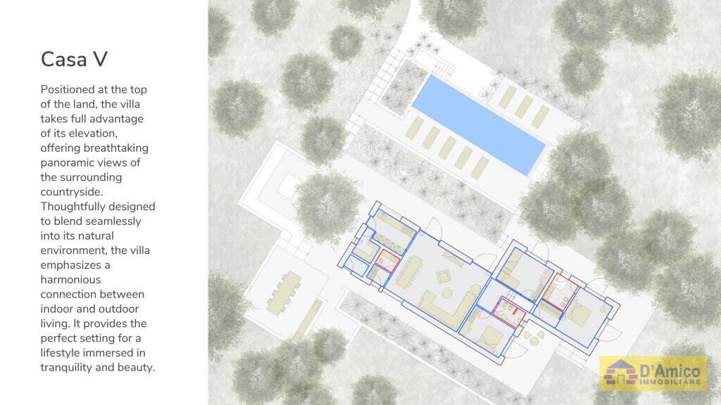 Disposta su un unico livello, la villa dispone di un ampio Living e zona Dining, con vista sulla Piscina, Cucina indipendente e bagno di servizio. La zona notte, riservata, si compone di 3 Camere da letto matrimoniali con 2 Bagni, immerse nel contesto naturale grazie alle grandi vetrate.