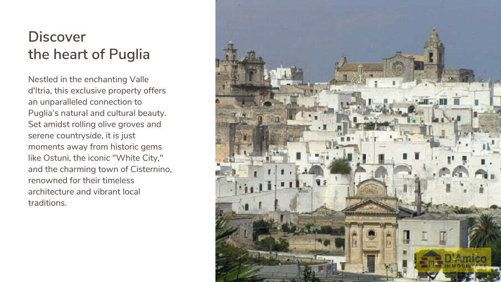 Ostuni è uno dei comuni che si inseriscono nel contesto della Valle D'Itria, tra i più frequentati, e si colloca a meno di 30 km dall'Aeroporto del Salento di Brindisi e a poco più di 40 minuti da Lecce. Nota anche come “la città bianca”, per via dei candidi prospetti dipinti a calce locale delle abitazioni dell’antico borgo medioevale centro storico, Ostuni è una delle cittadine più note ed affascinanti della Valle D’Itria.